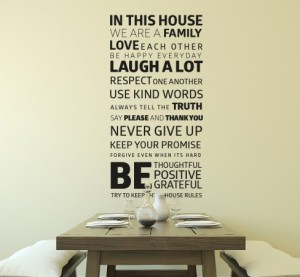 Ještě poutavější pro všechny, kdo ovládají angličtinu a kdo se snaží žít dle základních pravidel slušnosti, může být text In this house. Jde o několik pravidel, která bychom měli dodržovat a na něž bychom neměli zapomínat, aby naše rodinné vztahy fungovaly, jak mají. Použít je můžete jak do vstupní haly, tak do obývacího pokoje nebo ložnice. I barvy můžete opět libovolně měnit ve 13 různých variantách. Cena je za komplet a začíná už na 390 Kč.